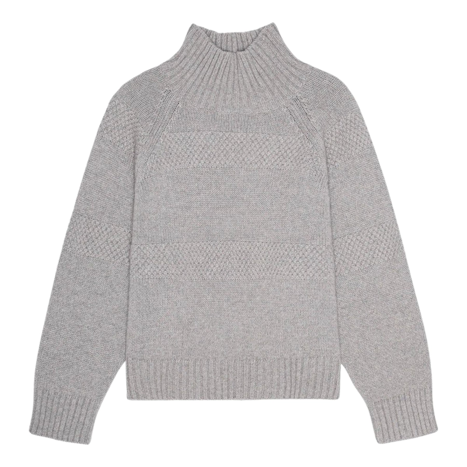 The MEA sweater has a high neckline, raglan sleeves, and wide, chunky ribbing on the hems, bottom, and cuffs.
